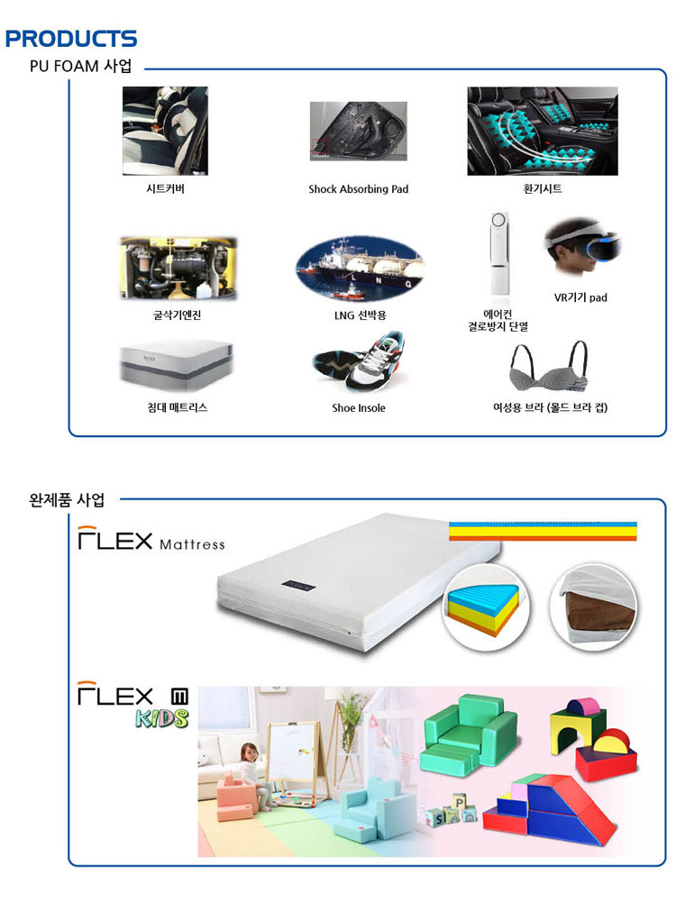 방음, 저탄성, 고탄성, 고경도, 화염코팅, 내황, 난연제, 항미생물, 필터 폼 등을 생산을하고있습니다.